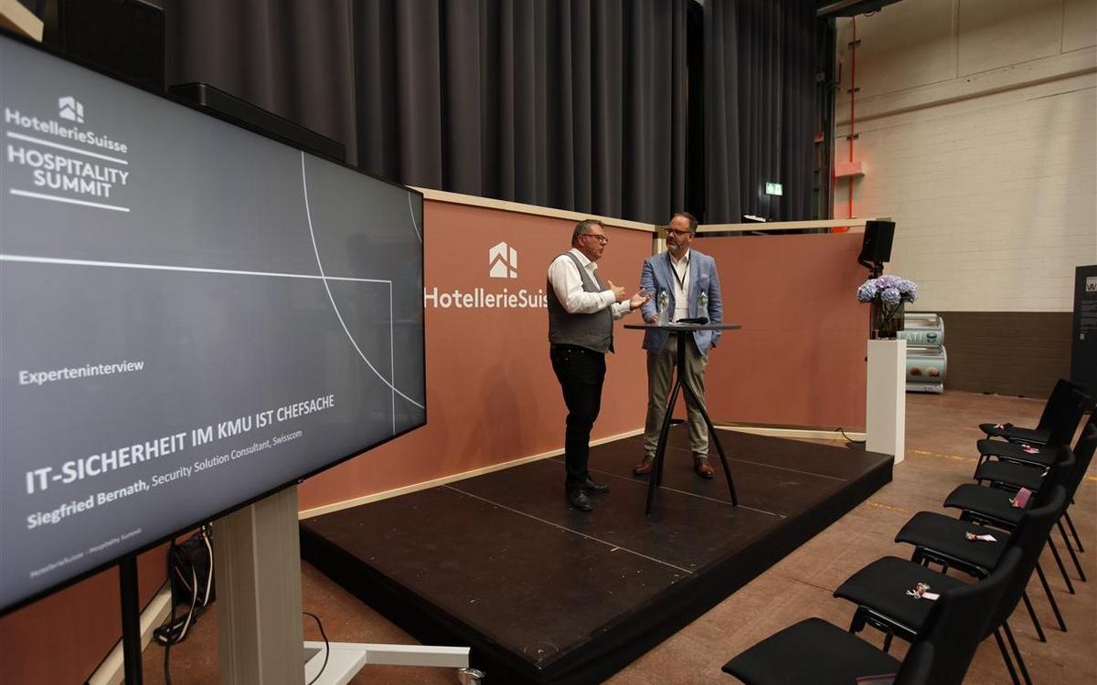 In der Netzwerkarena auf der Experten-Stage wird Siegfried Bernath, Security Solution Consultant bei Swisscom, von Moderator Stephan Lendi zum Thema IT-Sicherheit im KMU ist Chefsache befragt. In der Netzwerkarena auf der Experten-Stage wird Siegfried Bernath, Security Solution Consultant bei Swisscom, von Moderator Stephan Lendi zum Thema IT-Sicherheit im KMU ist Chefsache befragt. image : Susanne Keller, Philipp Schmidli, Nicole Philipp, Ueli Abt
