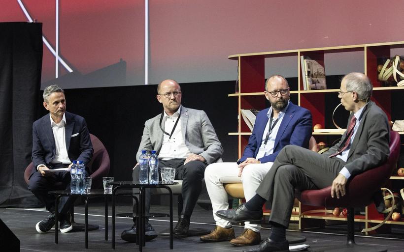 Gründer, Delarive, Cyril Aouizerate, Gründer, MOB HOTEL und MOB HOUSE Group und Moderatorin Maria Victoria Haas. Podiumsdiskussion zum Thema «We believe in …» (v.l.): Daniel Schneider, Gründer, Monoplan AG, Jürg Schmid, Mitinhaber, Schmid Pelli & Partner AG, Patrick Delarive,