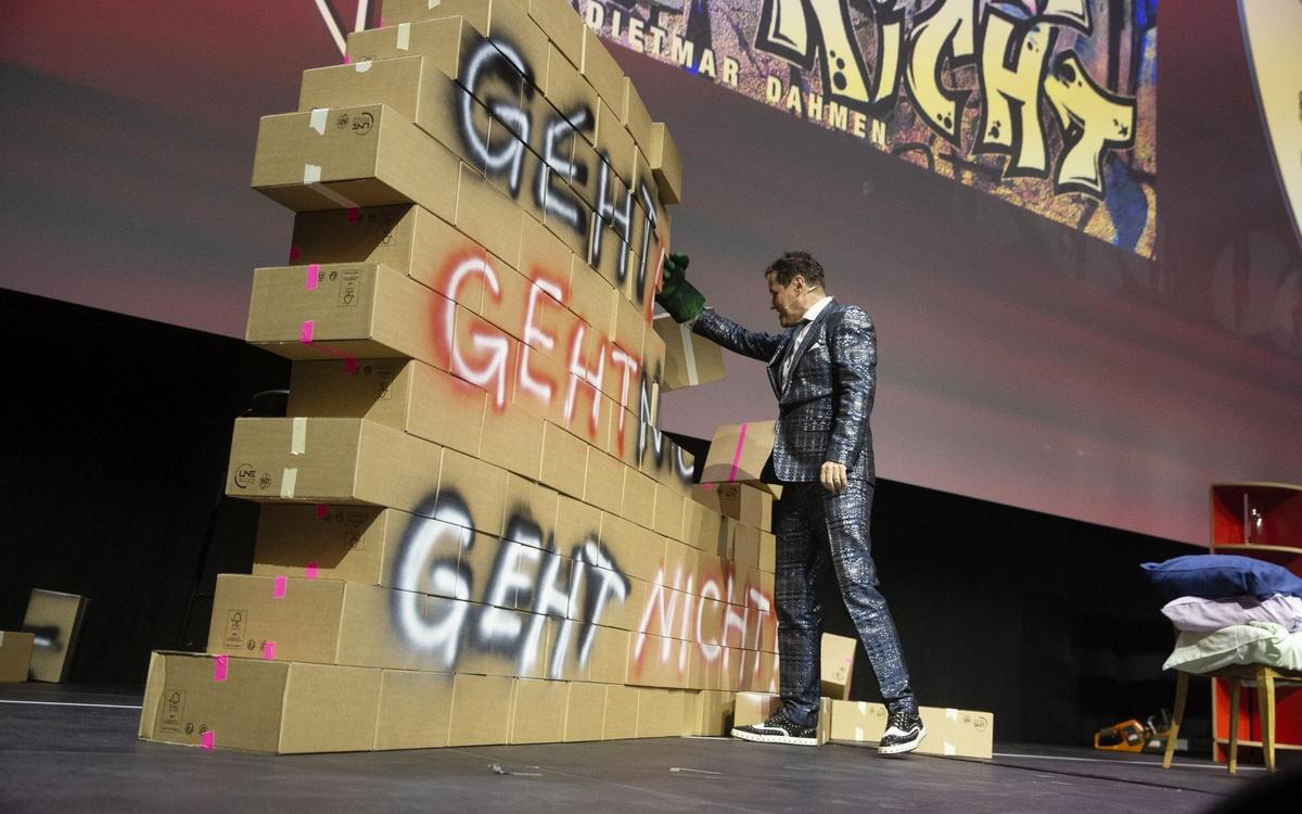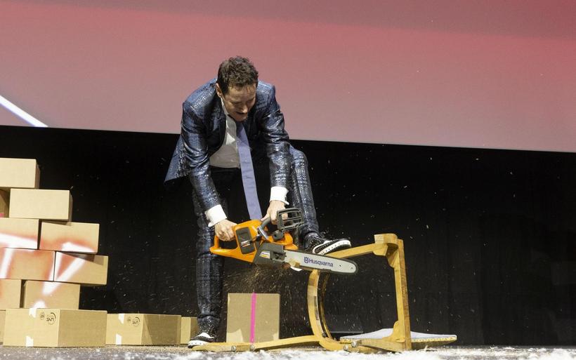 Dietmar Dahmen fährt bei seinem Keynote zum Thema «What's next» mit der Motorsäge auf. Dietmar Dahmen fährt bei seinem Keynote zum Thema «What's next» mit der Motorsäge auf. image : Susanne Keller, Philipp Schmidli, Nicole Philipp, Ueli Abt