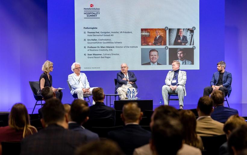 Podiumsdiskussion zum Thema «Gastronomie als Revenue Modell» mit (v.l.): Nicoletta Müller, Innovation, Sales & Marketing GmbH (Moderation); Thomas Frei, Gastgeber/Hotelier, VR-Präsident, Hotel Bernerhof Gstaad AG;