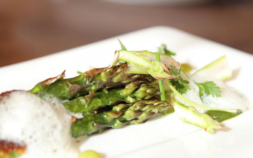 La nouvelle carte du Woods fait la part belle aux produits locaux et aux saveurs printanières comme les asperges cuites à la verticale en croûte de pistache et émulsion de Huacatay ou les artichauts poivrade en barigoule, tempura d’herbes du jardin et gelée de citron. On trouvera aussi un pavé de fera rôti poudré au paprika fumé, accompagné d’un riz façon paella et coulis de piquillos aux épices grillées ou encore un carré d’agneau de la région de Vessy en croûte d’herbes et ragoût de fèves de printemps.