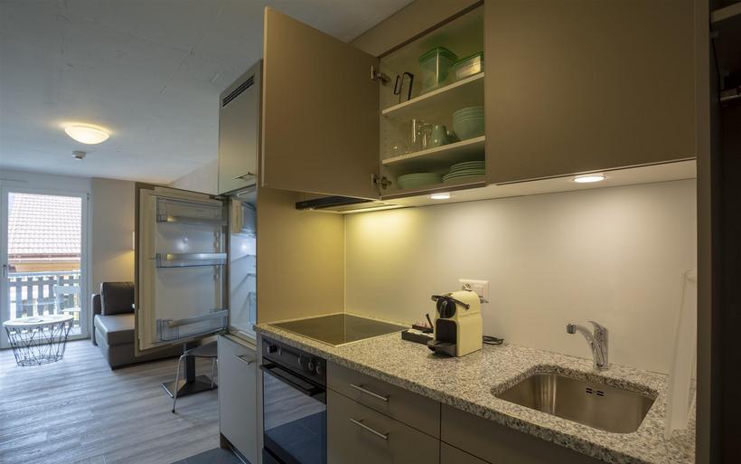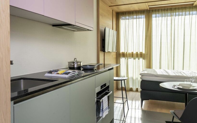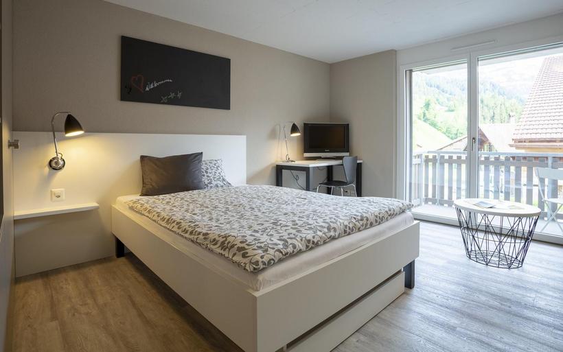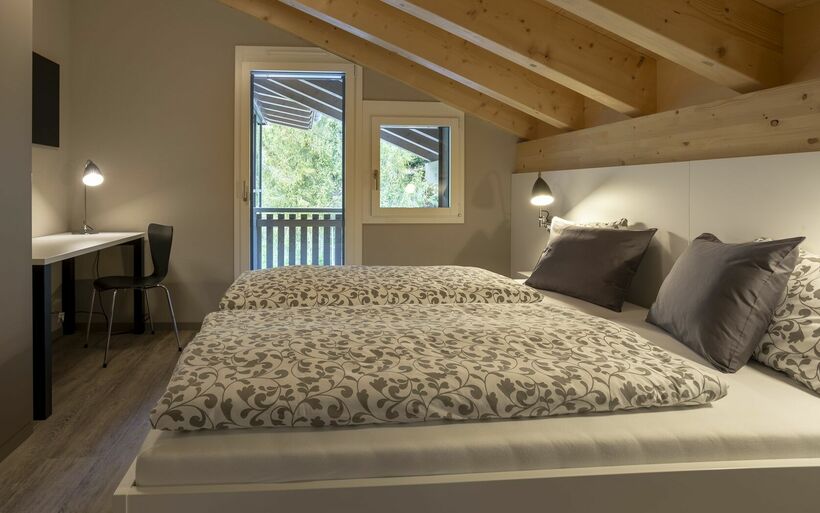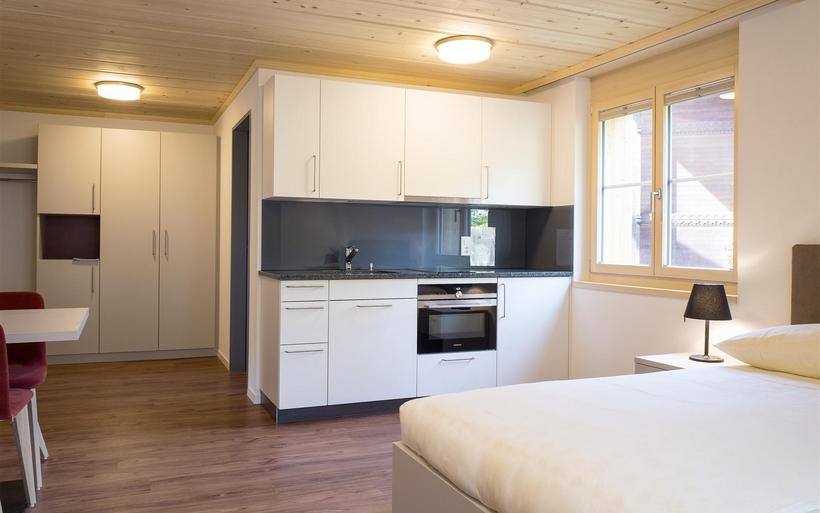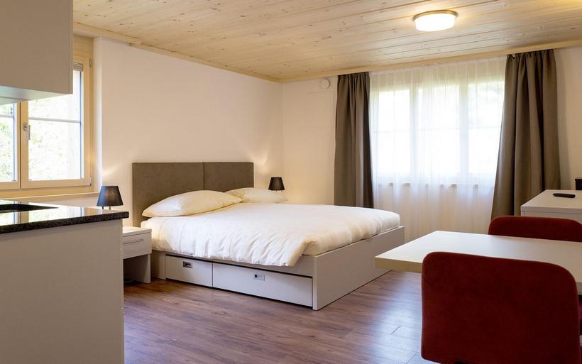Besonderes: Unterkunft entspricht 4-Stern-Superior-Hotelkategorie: hochwertig ausgestattet mit eigener Küche, begehbarem Kleiderschrank, heimeliger Holzdecke, modernem Bad mit Regendusche, grosszügigem Boxspring-Bett, Flatscreen-TV und W-LAN, Balkon oder Garten. In der Residenz hat es ein top ausgestattetes Fitness-Studio inklusive Panoramaverglasung. Den Mitarbeitenden steht ferner ein Seminarraum für Weiterbildungen, Yoga, Meditation und Feierlichkeiten zur Verfügung. Die Waschküche ist mit einer App steuerbar und in der Tiefgarage für Autos und Fahrräder hat es E-Ladestationen. Direkt nebenan ist ein Sportplatz.