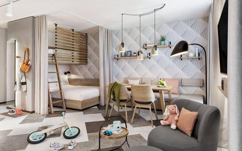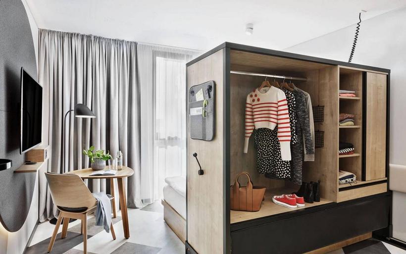 Das verschiebbare Modul «The Slide» ist das herausragende Merkmal des Raumkonzepts und ein Novum in der Hotellerie. Mit einem leichten Zug am Hebel lässt es sich hin- und herschieben und gibt entweder Platz frei für das Bett oder für eine voll ausgestattete Küche.