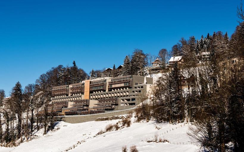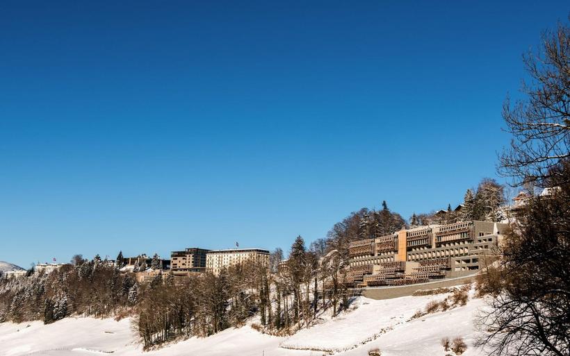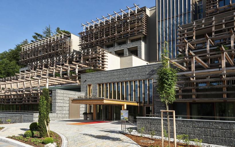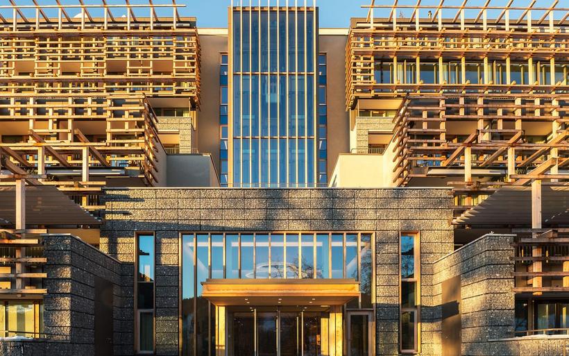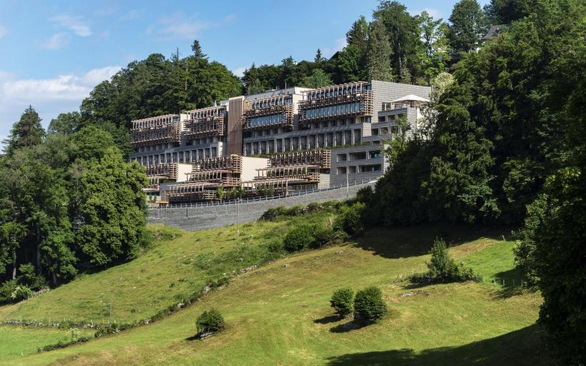 Das Waldhotel, ein Teil des Bürgenstock Resort, ist ein Meisterwerk moderner, nachhaltiger Architektur unter Berücksichtigung von Zero KM, Zero Abfall und Zero CO2. Es ist das weltweit grösste Gabionen-Gebäude. Inspiriert von der Walser Baukunst und der alpinen Tradition wurden lokale Materialien verwendet. Dank seiner Terrassenstruktur und den begrünten, natürlich isolierten Flachdächern fügt sich das Waldhotel perfekt in das Landschaftsbild ein.