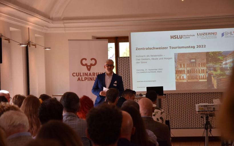 Noch ganz in der Euphorie des vorausgegangenen Stanserhorn-Ausfluges, zeigte Jürg Stettler, Institutsleiter Institut für Tourismus und Mobilität der Hochschule Luzern, auf, wie das Thema «Kulinarik» in den Tourismus eingebettet werden kann. Die Gastronomie hat einen enormen Einfluss auf Reisende: Rund 15 bis 35 Prozent des Reisebudgets werden für Essen und Trinken ausgegeben. Zudem kann die kulinarische Vielfalt eines Landes oder einer Stadt auch als Unterstützung der Wahl des Reiseziels dienen. Und trotzdem beträgt die Zufriedenheit der Gäste in der Schweiz im Bereich Gastronomie nur knapp 70 Prozent, hier besteht noch einiges an Verbesserungspotenzial auf der Angebotsseite.