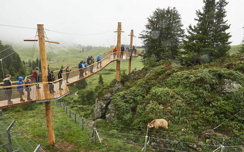 Der letztjährige Gewinner des Milestone-Tourismuspreises, das Arosa Bärenland, ist seit Freitagvormittag um eine Attraktion reicher: Der neue «schwebende» Abenteuerweg über das Gelände des Bärenparks wurde eröffnet. Das neue Highlight vom Bärenschutzzentrum besteht aus acht Aussichtsplattformen, die über Hängebrücken miteinander verbunden sind.