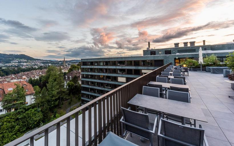 Die Bar auf der Dachterasse mit Blick über die Berner Altstadt, die Aare und die Alpen heisst neben den Hotelgästen auch externe Gäste willkommen. Vorerst Donnerstags bis Sonntags ab dem Nachmittag bis abends um 22 Uhr. (htr/lm)