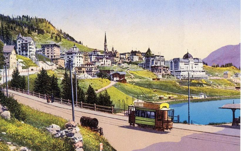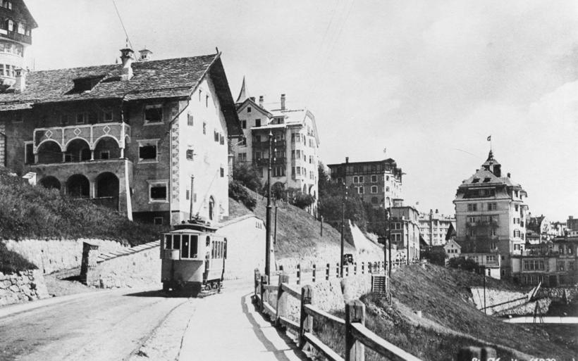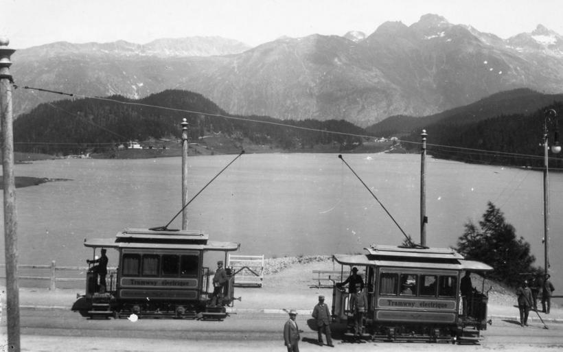 Im ausgehenden 19. Jahrhundert entstanden im Oberengadin nicht nur Hotelbauten, sondern auch zahlreiche weitere Infrastrukturen im Dienst des Tourismus. So pendelte ab 1896 in den Sommermonaten auch eine elektrische Strassenbahn zwischen dem Bad und dem Dorf, einige Jahre bevor die ersten Dampfzüge 1903/1904 das Engadin erreichten. Die Trambahn hatte ihren Ausgangspunkt in St. Moritz Bad bei der Heilquelle. Von dort fuhr die Strassenbahn dem Hotel Du Lac entlang und erreichte die Innbrücke. Dann begann die Steigung nach St. Moritz Dorf, wo die Bahn am Postplatz vor dem Hotel Schweizerhof endete.