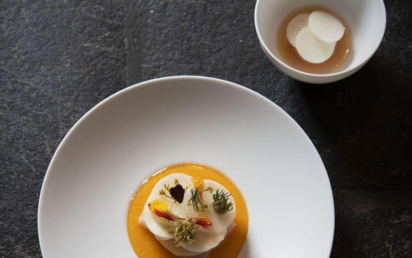 Andrea Caminadas erste Kreation, passend zum Dom Pérignon Vintage 2002 – Plénitude 2, ist Saibling mit Quitten und Kohlrabi. Der Saibling ist leicht gegart und leicht geräuchert, während die Quitte dem Gericht eine erdige Note, aber gleichzeitig auch etwas Aromatisches verleiht. Der Kohlrabi ist auf verschiedene Arten mariniert, eingelegt sowie fermentiert, und bringt seine eigene Frische und Knackigkeit mit.