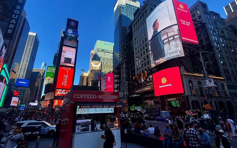 [IMG 3]Der US-Markt wird gerade auch in dieser Woche mit einer besonderen Aktionen vor Ort beworben: Ebenfalls an der stark frequentierten Kreuzung Broadway und Seventh Avenue macht ST mit einem neuen Kurzvideo Werbung für das Ferienland Schweiz.