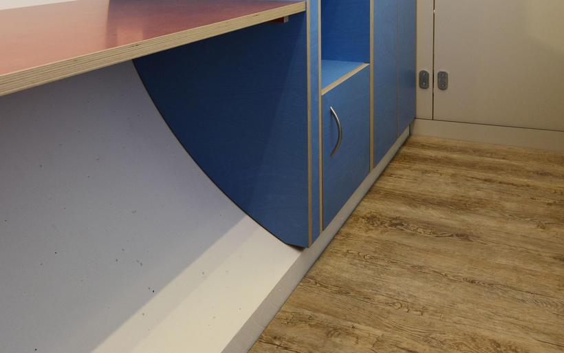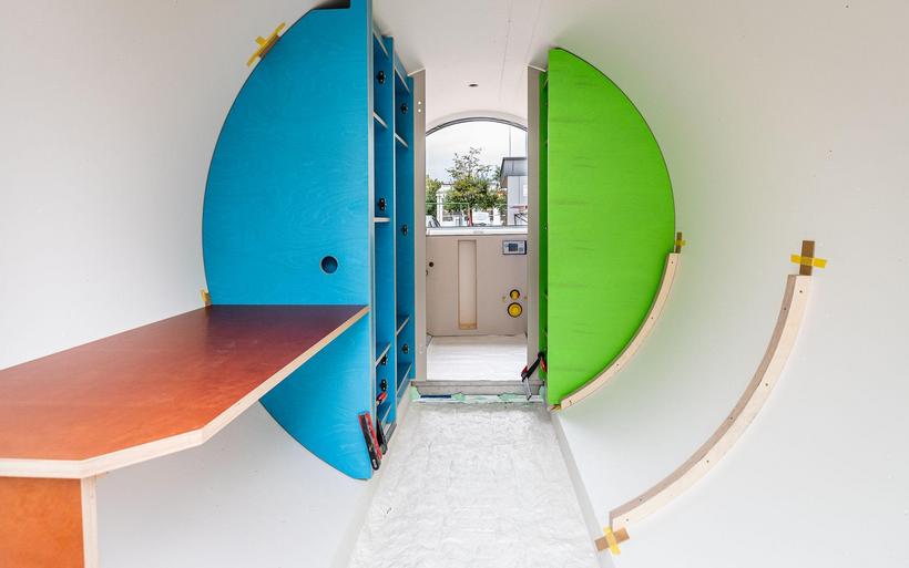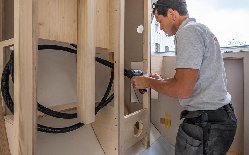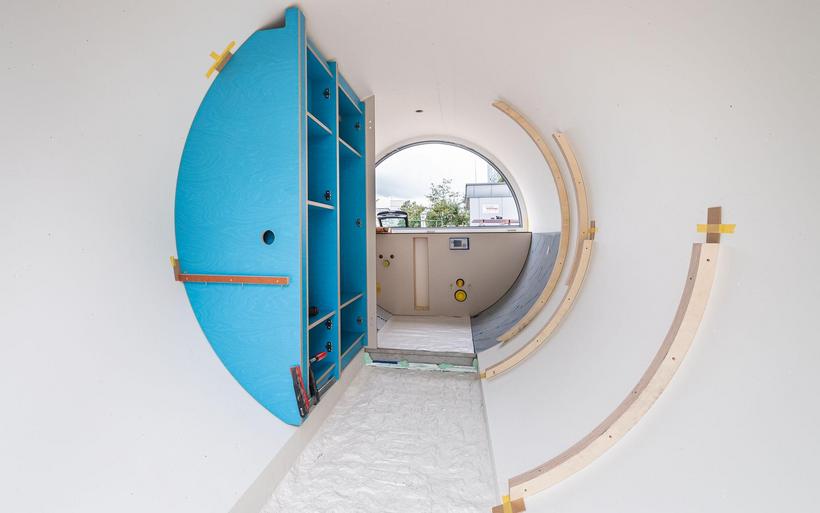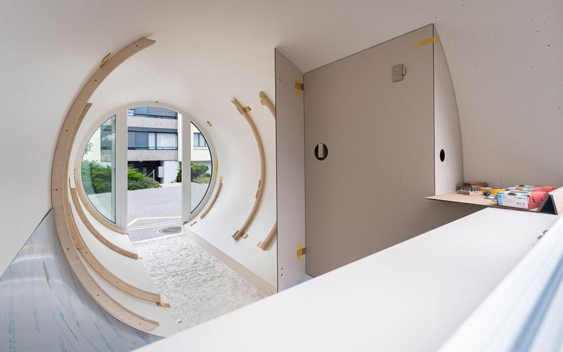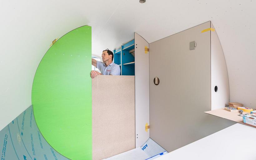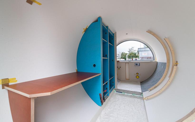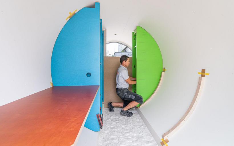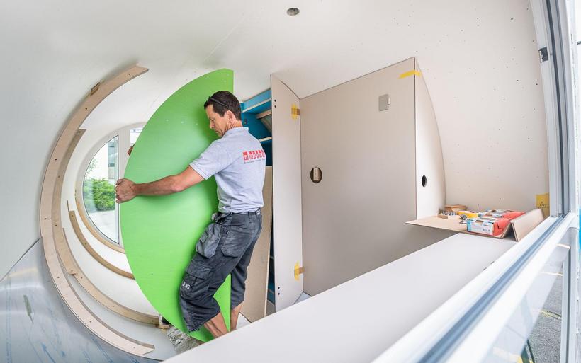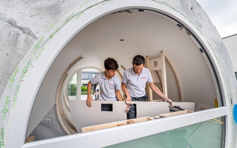 Das elektrifizierte Röhrenzimmer verfügt neben Schlafsofa, Tisch und Einbauschränken über eine durchdachte Badeinrichtung inklusive Lüftung sowie eine Fussbodenheizung. «Ob begehbarer Kleiderschrank oder beheizte Hundehütte – Spezialanfertigungen sind unser Steckenpferd», sagt Schreinermeister Rolf Brändle. «Eine kompakte Zimmerausstattung in einem kreisrunden Raum ist aber durchaus nichts Alltägliches. Die Herausforderung besteht darin, auf kleiner Fläche umfassenden Komfort zu bieten und dabei trotzdem ein grosszügiges Raumgefühl zu erzeugen». Wie die Herausforderung gemeistert wurde, können die Besucherinnen und Besucher der Zuger Messe bestaunen.