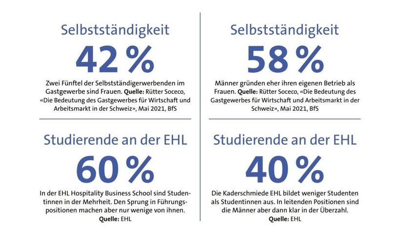 Wie sieht es bei der jungen Generation aus? Sind die jungen Kader im Gastrobereich weiblicher? Leider zeigt sich auch beim Nachwuchs ein traditionelles In der EHL Hospitality Business School mit ihren drei Campus in Lausanne, Chur-Passugg und Singapur sind 60 Prozent der Studierenden weiblich. Doch nur 17 Prozent der Absolventinnen und Absolventen der EHL, die eine Führungspositionen einnehmen, sind Frauen.