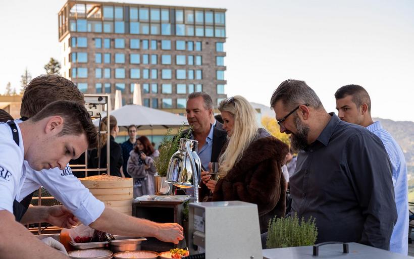 Bei strahlendem Wetter empfing Culinary Director Mike Wehrle und seine Gastköche 230 Food-Liebhaber auf der Terrasse des Palace Hotels, im Restaurant RitzCoffier und im Salon 1903. Die am Gourmet-Festival teilnehmenden Guest Chefs waren mit je einer Food Station vertreten. Highlights waren das Kaisergranat (Entenleber, grüner Apfel und Sainte Maure) von Sternechef Juan Amador sowie das Wagyu-Fond und Dashi-Sabayon vom österreichischen Sternechef Alois Traint.[IMG 6]