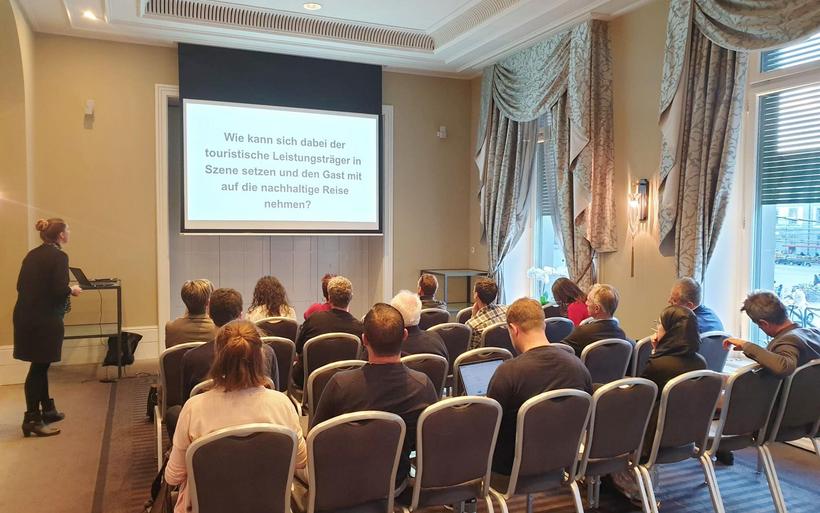 ]Im zweiten Teil wurden konkrete Nachhaltigkeitslösungen für die Praxis vorgestellt. Die Breite des Angebotes beinhaltete erste Schritte zur Implementierung von Myclimate «Cause We Care», die betriebliche Ökobilanzierung mit Myclimate smart3, die Vermeidung von Foodwaste durch die digitale Lösung von Kitro, Nachhaltigkeitszertifizierungen mit den Partnern TourCert und Ibex Fairstay sowie die komplett chemiefreie Raumreinigungslösung Medicleantec Microsteam.