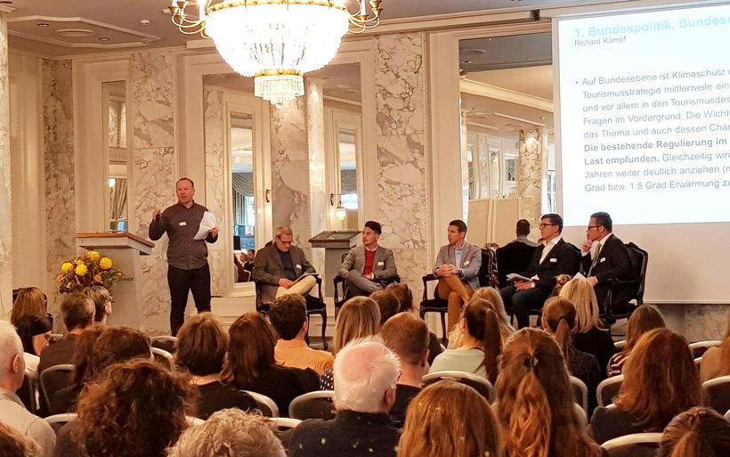 Im Hotel Schweizerhof Bern diskutierten vor rund 90 Teilnehmenden Stefan Forster von der ZHAW, Richard Kämpf vom Seco, Marc Sommer vom STV, der Hotelier des Jahres 2018 Kurt Baumgartner, Roland Zegg von grischconsulta und Samuel Wille von Schweiz Tourismus zu den Herausforderungen und Chancen für einen nachhaltigen Tourismus in der Schweiz.