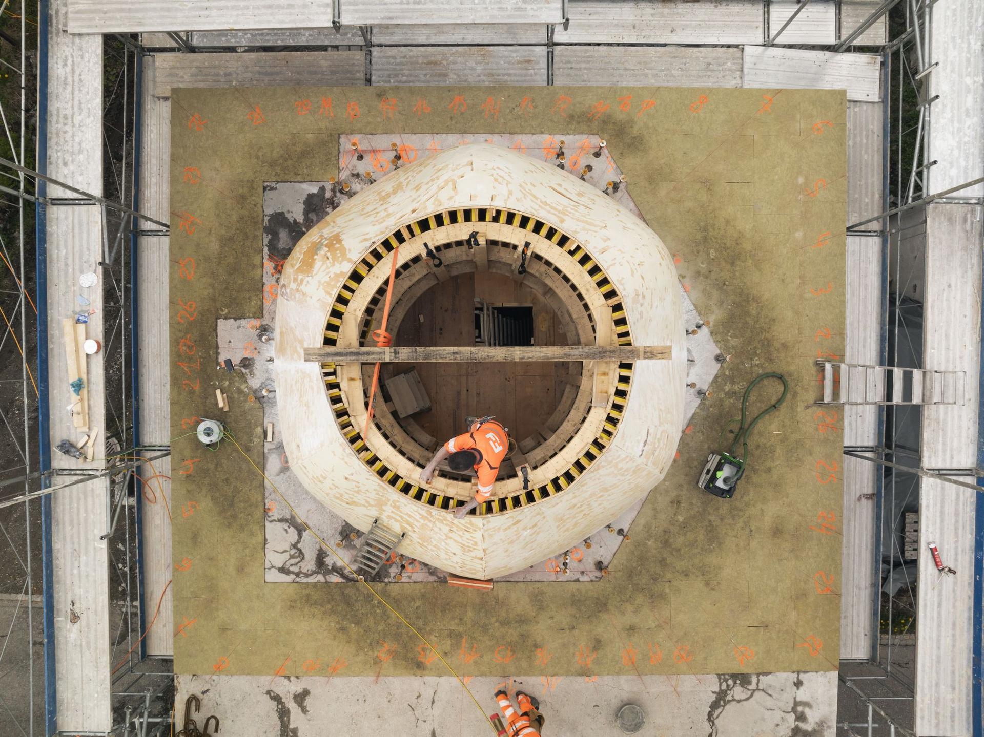 In Mulegns wurde am 10. Juli das erste Stockwerk des Weissen Turmes errichtet. Die jahrelange Planung, die vielen Testreihen, das ästhetische Ringen, die komplizierten Genehmigungsprozesse: All dies rückte mit dem Bau ein wenig in den Hintergrund. «Die scheinbar schwerelos fliegenden Säulen, die Präzision der Bauarbeiten, die skulpturale Kraft der ersten Säulenreihe lässt die Mühen vergessen», schreibt die Bauherrin Nova Fundaziun Origen.[RELATED]