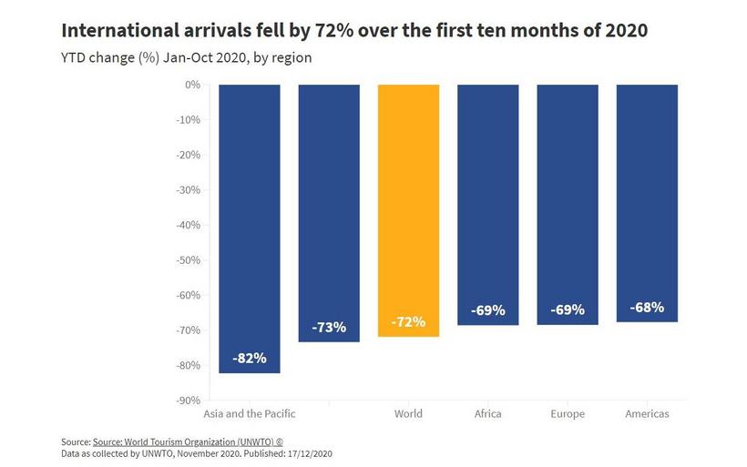 Asien und der Pazifik, die erste Region, die unter den Auswirkungen der Pandemie zu leiden hatte und die bisher höchsten Reisebeschränkungen verhängte, verzeichnete in den ersten zehn Monaten des Jahres 2020 einen Rückgang der Ankünfte um 82 Prozent. Der Mittlere Osten verbuchte einen Rückgang von 73  Prozent, während Afrika einen Rückgang von 69 Prozent verzeichnete. Die internationalen Ankünfte in Europa und Nord- und Südamerika gingen um 68 Prozent zurück.
