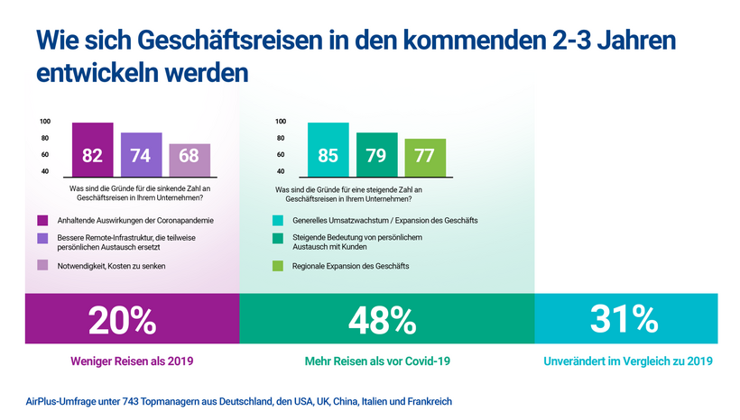 Durch die hohe Bedeutung von persönlichem Austausch mit Käufern, Klienten und Mandanten sieht immerhin knapp die Hälfte der Befragten in den kommenden zwei bis drei Jahren sogar mehr Geschäftsreisen als noch 2019. Unter denjenigen, die mehr Reisen erwarten, nannten dies 79 Prozent als Grund für die Zunahme der Geschäftsreisen, 85 Prozent ein generelles Umsatzwachstum. Knapp ein Drittel aller Befragten sieht bei der Anzahl der Reisen mittelfristig zumindest wieder den Vor-Corona-Zustand erreicht.